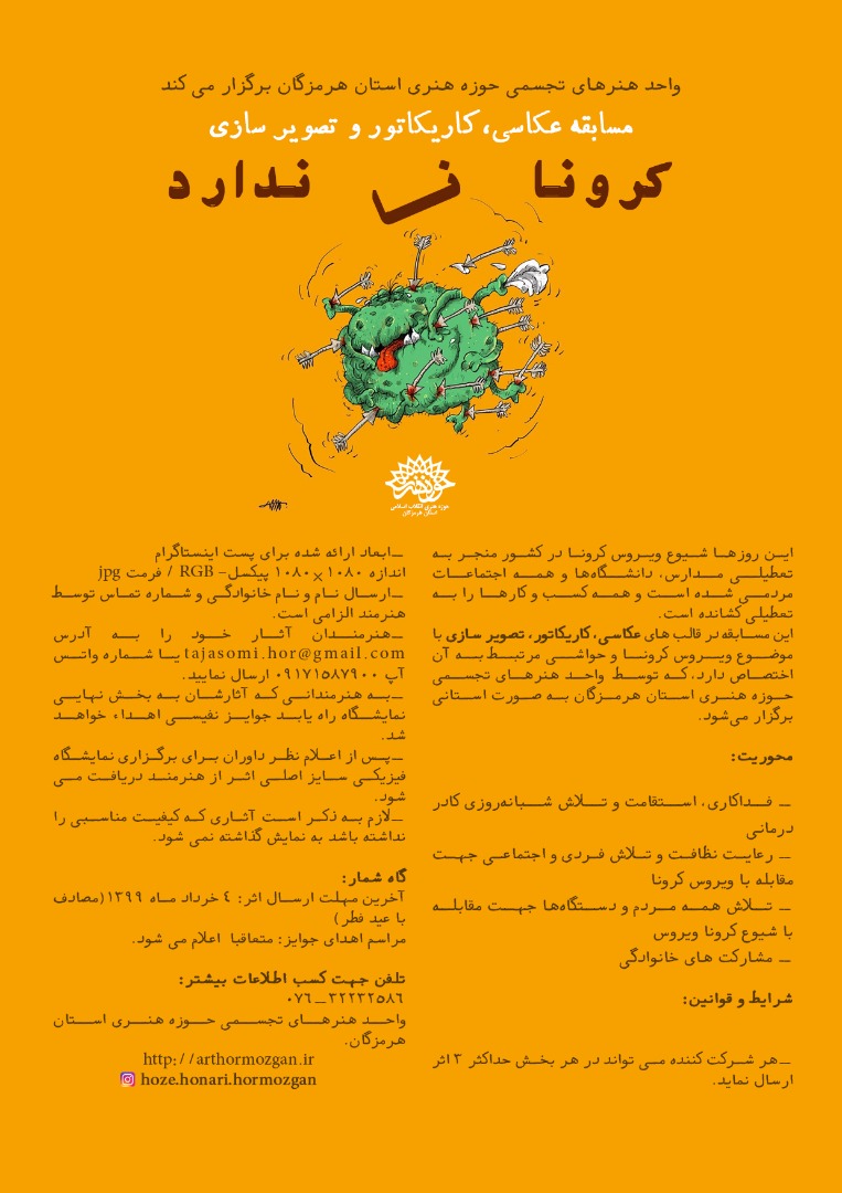 بر این اساس مسابقه " کرونا نا ندارد " در قالب های عکاسی، کاریکاتور و تصویر سازی با موضوع ویروس کرونا و حواشی مرتبط به آن اختصاص دارد، که توسط واحد هنرهای تجسمی حوزه هنری استان هرمزگان به صورت استانی برگزار میشود.