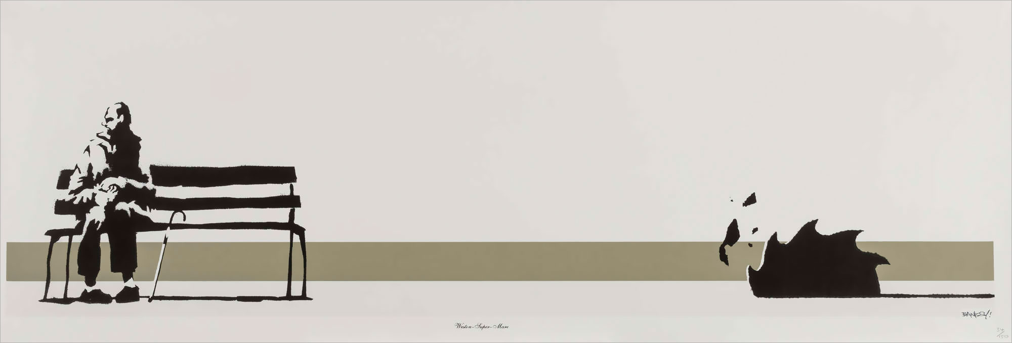 بنکسی در وستون سوپر مار یک شهروند سالخورده را تصویر میکند که روی نیمکتی کز کرده و به هیچ وجه متوجه خطر ارّه دیسکی که به او نزدیک میشود، نیست. این ارّه نمادی از مرگ است که بر حیات فانی تکتک انسانها سایه انداخته بدون این که متوجه آن باشند.
