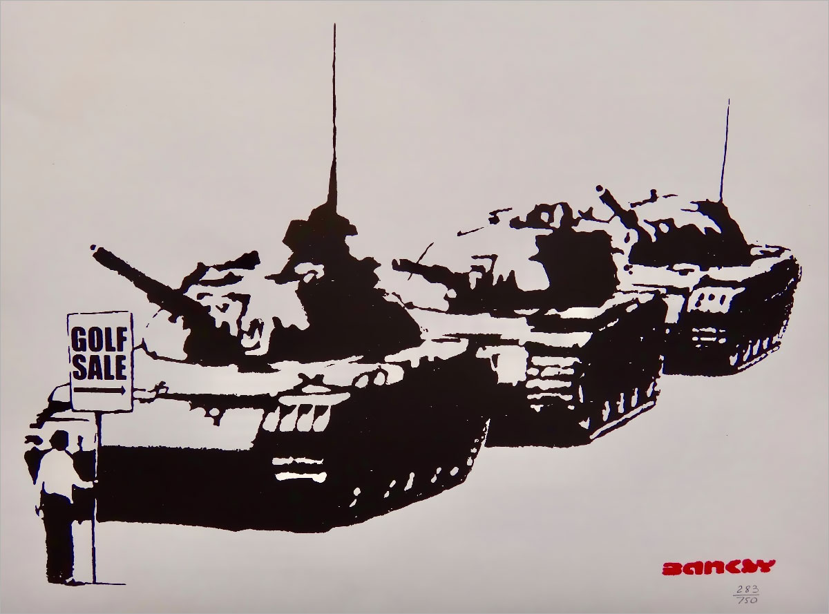 حراجی گلف (۲۰۰۳) یکی از اولین آثار بنکسی است که وی در آن تصویر ایستادگی یک مرد در برابر تانکهای میدان تیانآنمن که به عنوان یکی از نمادهای تاریخی اعتراض سیاسی شناخته میشود، را به فراخور نقد از فرهنگ مصرفگرایی تغییر داده است.