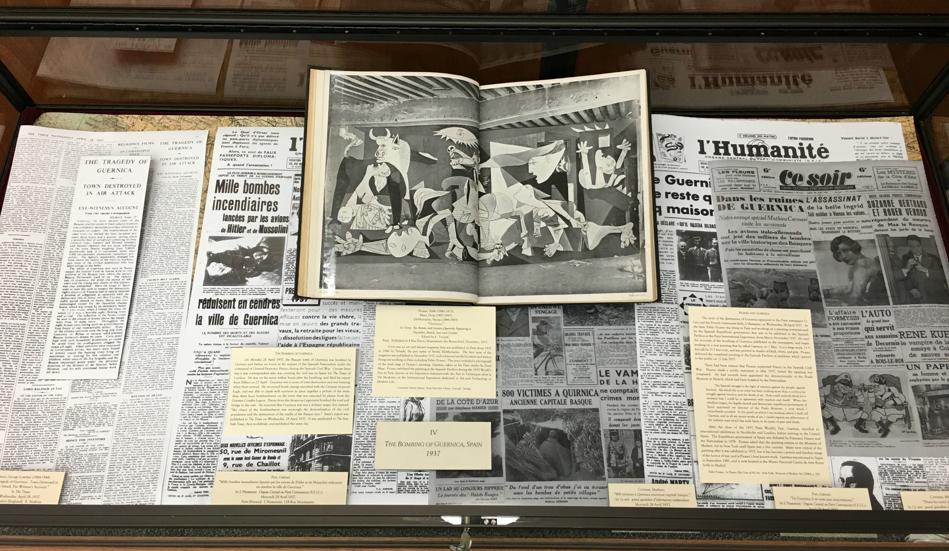 به‌درستی معلوم نیست که پیکاسو در چه زمانی از بمباران گرنیکا مطلع شد؛ زیرا در آن زمان در فرانسه دیواری از سکوت گرد این خبر را فراگرفته بود و بیم آن می‌رفت که با انتشار این خبر دولت جبهه خلق را وادار سازد تا تحت‌ فشار افکار عمومی به حمایت از جمهوری خواهان وارد جنگ شود، اما در پایان هفته که شایعات و اخبار با هم درآمیخته شده بود بالاخره در بعدازظهر روز 30 آوریل روزنامه سو سوار(ce soir)، به مدیریت «آراگون» خبر حمله هوایی علیه گرنیکا را در چهار ستون منتشر ساخت. عناوین درشت، خبر بمباران را تائید می‌کرد و سه تصویر همراه خبر ویرانی‌های شهر را در شعله‌های آتش‌نشان می‌داد.
