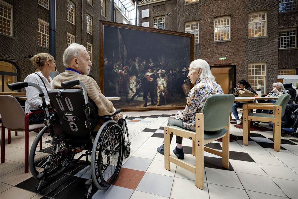 ساکنان خانه سالمندانی در آمستردام، روبه روی تابلوی "پاسِ شبانه" The Night Watch، اثرِ "رامبراند" نقاش مشهور هلندی نشسته اند.