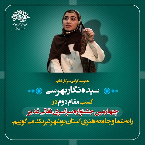 هنرمند استان بوشهر، مقام دوم چهارمین جشنواره سراسری پرده‌خوانی و نقالی غدیر (نقالان علوی) را کسب کرد.