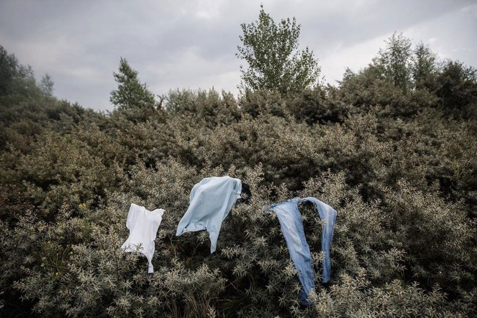 خشک کردن لباس‌های مهاجران کمپ موقت حومه شهر «کاله»(فرانسه) روی درختان / منبع: خبرگزاری فرانسه