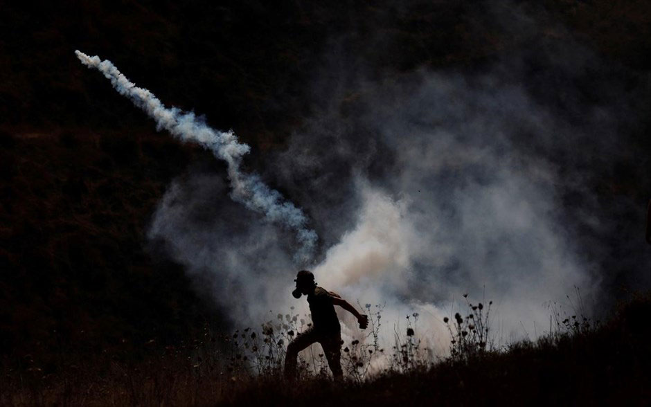 یک معترض فلسطینی گلوله گاز اشک‌آوری را که حین اعتراضات علیه شهرک‌سازی اسرائیل و عادی‌سازی روابط برخی اعراب با اسرائیل، توسط نیروهای اسرائیلی به سمت معترضان پرتاب شده است، بازمی‌گرداند / منبع: رویترز