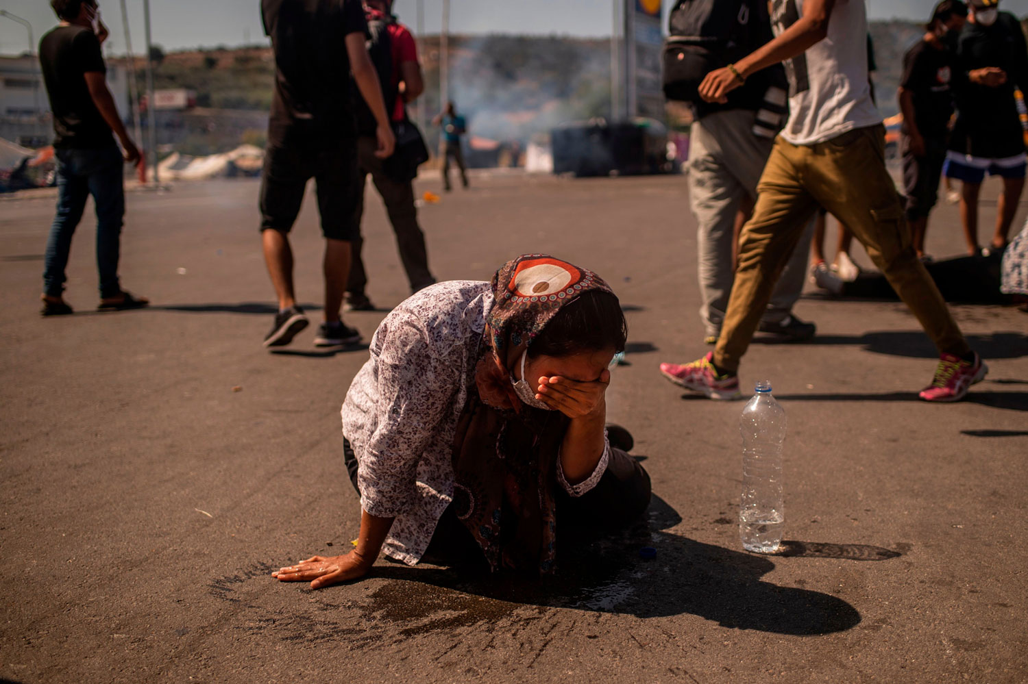 یک زن پس از پرتاب گاز آشک‌آور توسط پلیس چشمهایش را با آب می‌شوید. پس از آنکه کمپ «ماریو» در یونان در آتش سوخت، پلیس به سمت مهاجرانی که در اعتراضات برای درخواست پناهگاه سنگ‌پرتاب می‌کردند، گاز اشک‌آور پرتاب کرد /