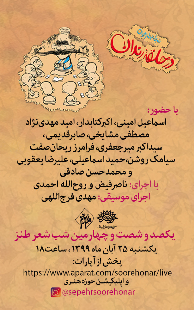 164اُمین شب شعر طنز در حلقه رندان یکشنبه 25 آبان‌ماه 1399 ساعت 18 به صورت آنلاین و از طریق سایت آپارات پخش خواهد شد.