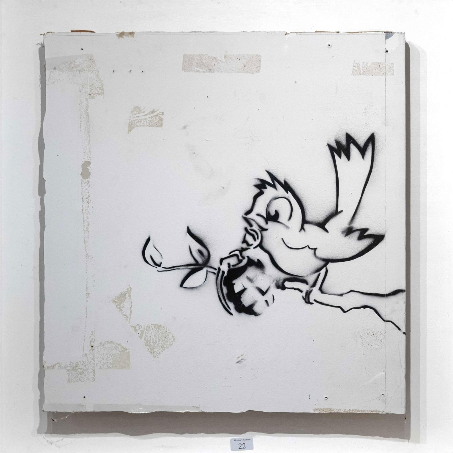 نقاشی «پرنده و نارنجک» که با اسپری رنگ سیاه خلق شده است، پرنده‌ای را به تصویر می‌کشد که یک نارنجک از منقارش آویخته شده است.