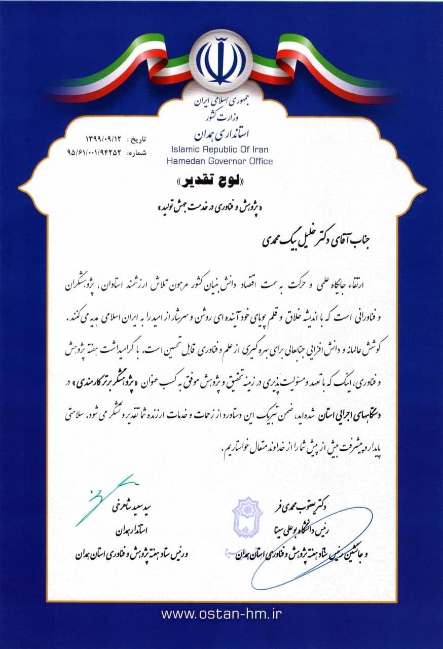 شایان ذکر است دکتر خلیلالله بیک محمدی پیشتر نیز به عنوان کارمند حوزه هنری همدان، سه دوره در سالهای 1395، 1396 و 1398 پژوهشگر برتر دستگاههای اجرایی استان شده است.