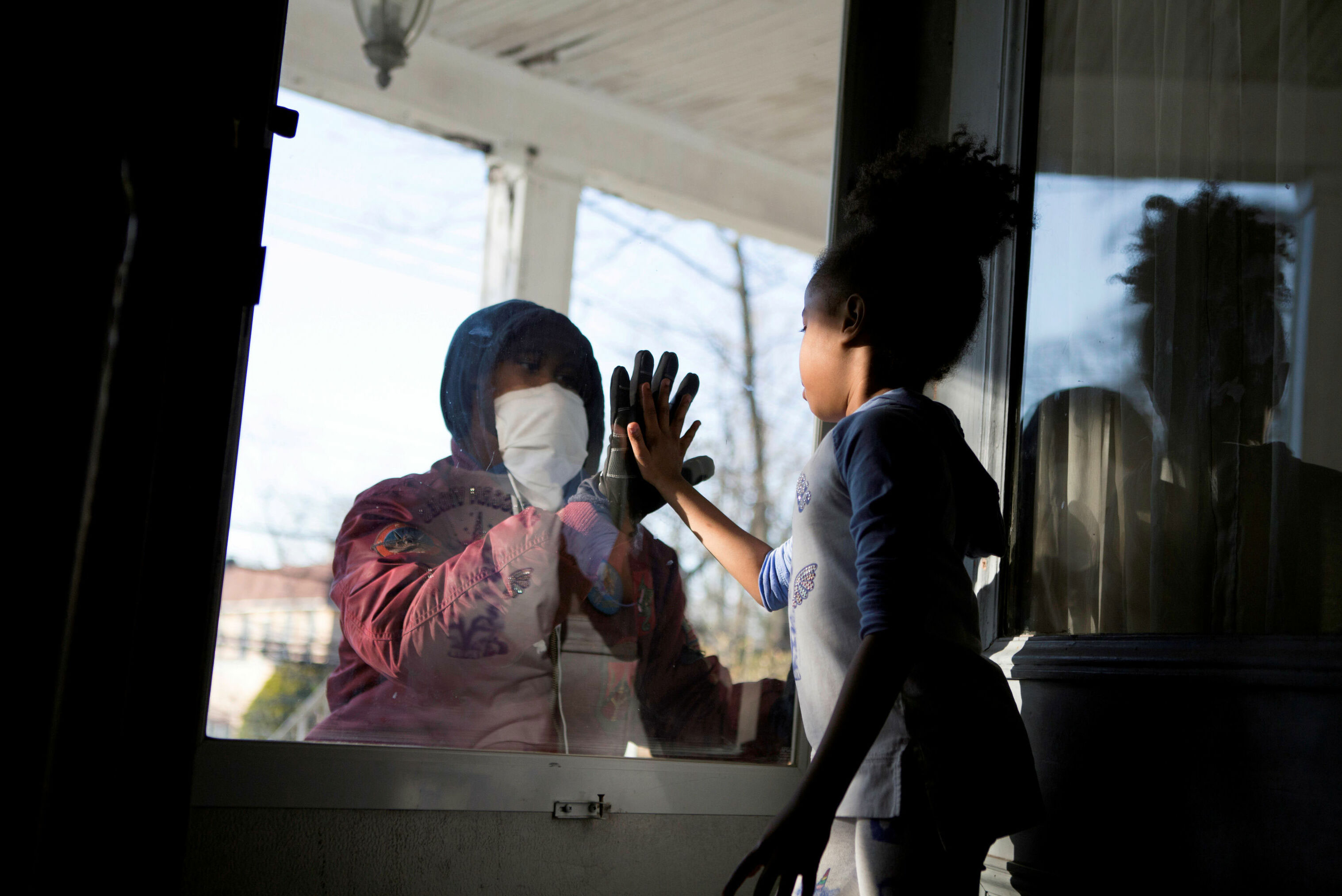یکی از متخصصان حوزه سلامت که در شیوع دوران ویروس کرونا مشغول فعالیت است با رعایت فاصله اجتماعی با دخترش ملاقات میکند / نیویورک / ۱۱ آوریل ۲۰۲۰