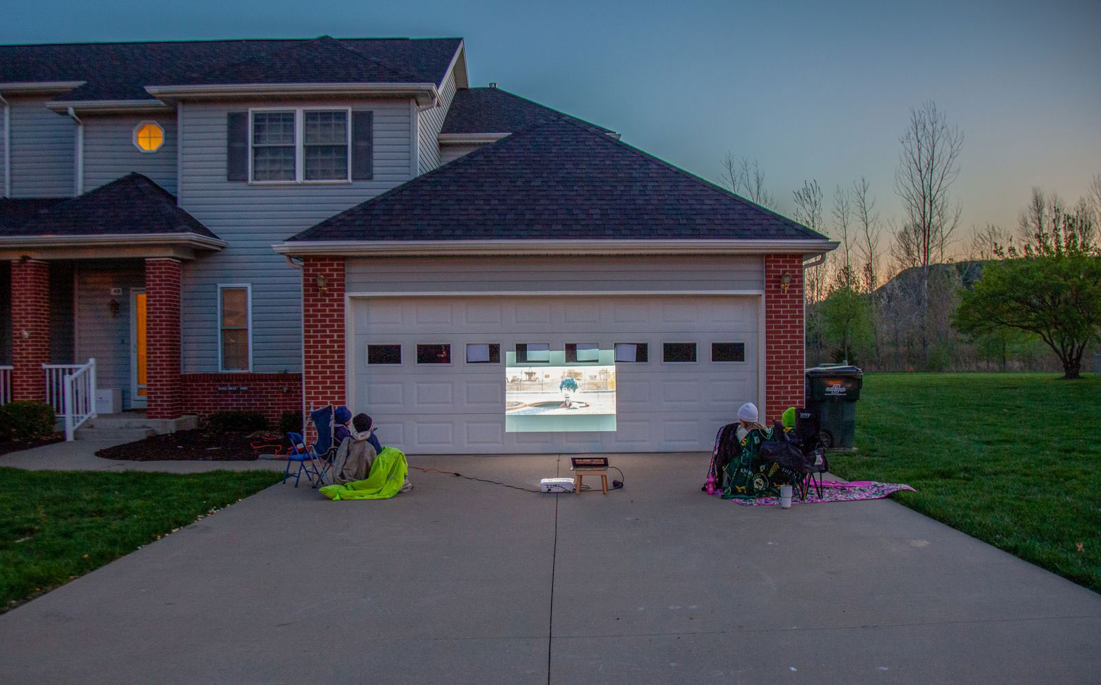 فرزندان دو خانواده با رعایت فاصله اجتماعی در فضای باز فیلم تماشا میکنند / کانزاس / ۸ آوریل ۲۰۲۰