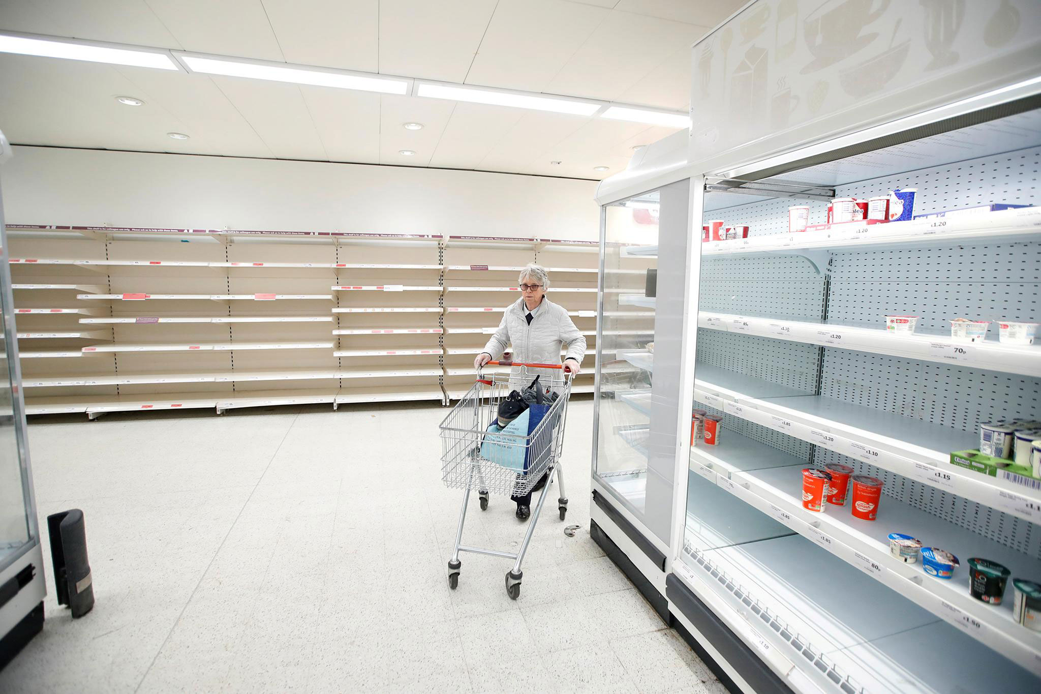 تصویری از یک خریدار در میان قفسههای خالی فروشگاهی در «هارپندن» / بریتانیا / ۱۸ مارس ۲۰۲۰