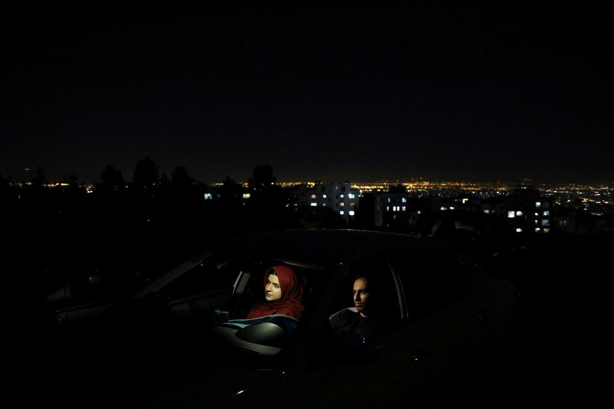 یک زوج ایرانی در یک سینما ـ ماشین واقع در محوطه پارکینگ برج میلاد به تماشای فیلم نشستهاند / ایران / ۳ مه ۲۰۲۰
