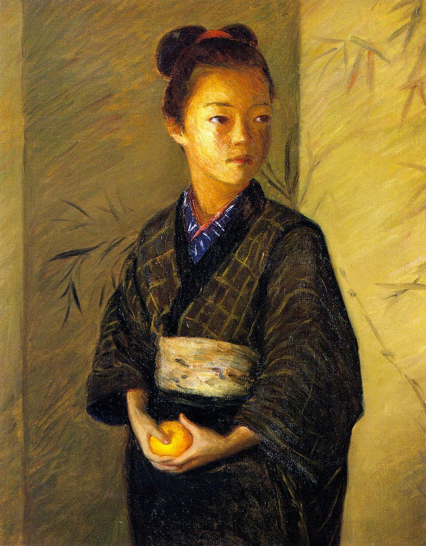 «لیلا کابوت پِری» نقاش آمریکایی در بین سالهای ۱۸۹۸ تا ۱۹۰۱ به ژاپن نقل مکان کرد. «کابوت پری» در آن جا این فرصت را داشت که درباره هنر ژاپنی به طور مفصل مطالعه کند. او در زمان سکونتش در ژاپن حدود ۸۰ تابلو نقاشی خلق کرد که «پرتره دختر جوان با یک پرتقال» هم یکی از آنهاست.
