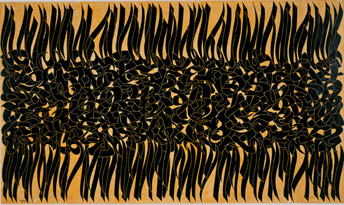 ترکیب بندی های سبز، قهوه ای، سیاه و سفید او به طور ملموسی متاثر از طرح های خطاطانه موجود در معماری اسلامی است، جایی که تنها یک حرف اهمیتی معادل ستون اصلی در بنا پیدا می کرد و چیزی نمی توانست جایگزین آن شود.