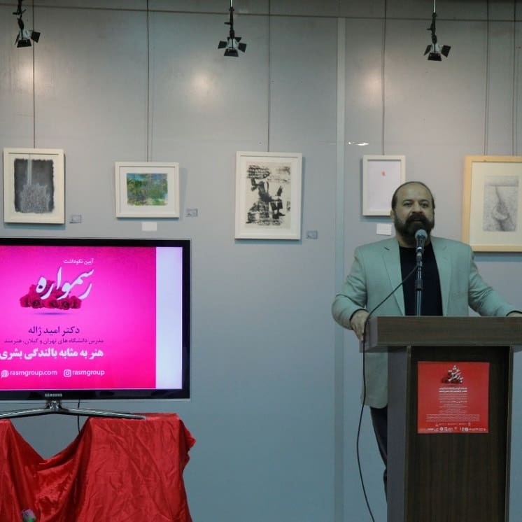 در ابتدای این آیین دکتر امید ژاله مدرس دانشگاههای تهران و گیلان به بحث دربارهی هنر به مثابه بالندگی پرداختند. وی با اشاره به اینکه انسان در همهی اعصار تاریخ، بهوسیلهی « هنر » به شناخت اولیه از خود و جهان هستی دست یافته است و در همین راستا هست که، آموزش را همراه همیشگی هنر برشمرند.