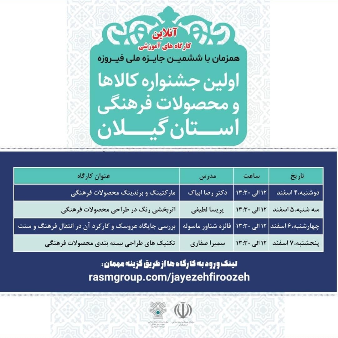 همچنین کارگاه های آموزشی متفاوت با موضوعات مارکتینگ و برندینگ محصولات فرهنگی، اثربخشی رنگ در طراحی محصولات فرهنگی، بررسی جایگاه عروسک و تاثیر و نقش آن در انتقال فرهنگ و سنت، نیز تکنیک های طراحی بسته بندی محصولات فرهنگی از تاریخ ۴ الی ۷ اسفند سال جاری، از ساعت ۱۲ الی ۱۳:۳۰، به آدرسhttp://rasmgroup.com/jayezehfiroozeh برگزار می گردد. دکتر رضا ابیاک، سمیرا صفاری، فائزه شناور ماسوله و پریسا لطیفی، مدرسین این کارگاه ها بوده که از اساتید دانشگاه های تهران، گیلان، هرمزگان و کرمان می باشند.