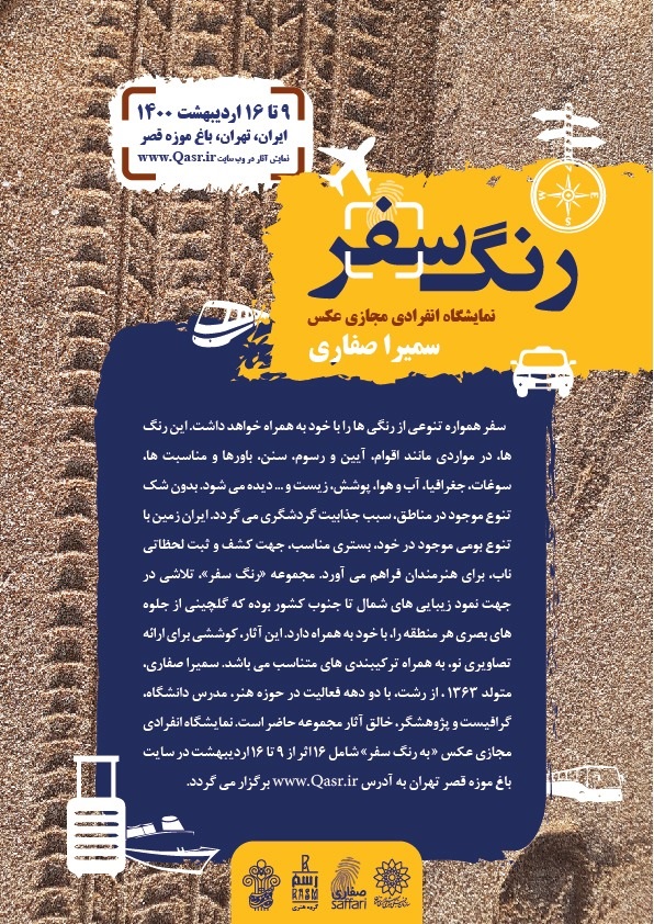 گفتنی است نمایشگاه انفرادی مجازی عکس «رنگ سفر» شامل 16 اثر عکس تا 16 اردیبهشت ماه در سایت باغ‌موزه قصر، www.Qasr.ir برپاست. برگزارکننده نمایشگاه گروه هنری رسم می باشد.