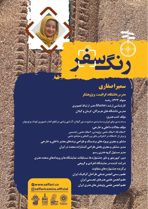 به گزارش روابط عمومی مرکز تجسمی حوزه هنری، سمیرا صفاری متولد ۱۳۶۳ شهررشت، مدرس دانشگاه، گرافیست و پژوهشگر، فارغ التحصیل رشته ارتباط تصویری در مقطع کارشناسی ارشد است. وی سابقه بیش از دو دهه فعالیت در حوزه طراحی گرافیک، دبیر، کیوریتور و داور جشنواره ها، مسابقات، نمایشگاه ها و رویدادهای متعدد هنری را دارد و مدیر و مشاور و مجری برندینگ می باشد. همچنین کتب و مقالات داخلی و خارجی متعدد را به تألیف رسانده و در نمایشگاه انفرادی و گروهی متفاوت شرکت نموده است. این هنرمند، عضو رسمی انجمن صنفی طراحان گرافیک ایران، انجمن علمی هنرهای تجسمی ایران، انجمن علمی پژوهش های هنری ایران و ... می باشد.