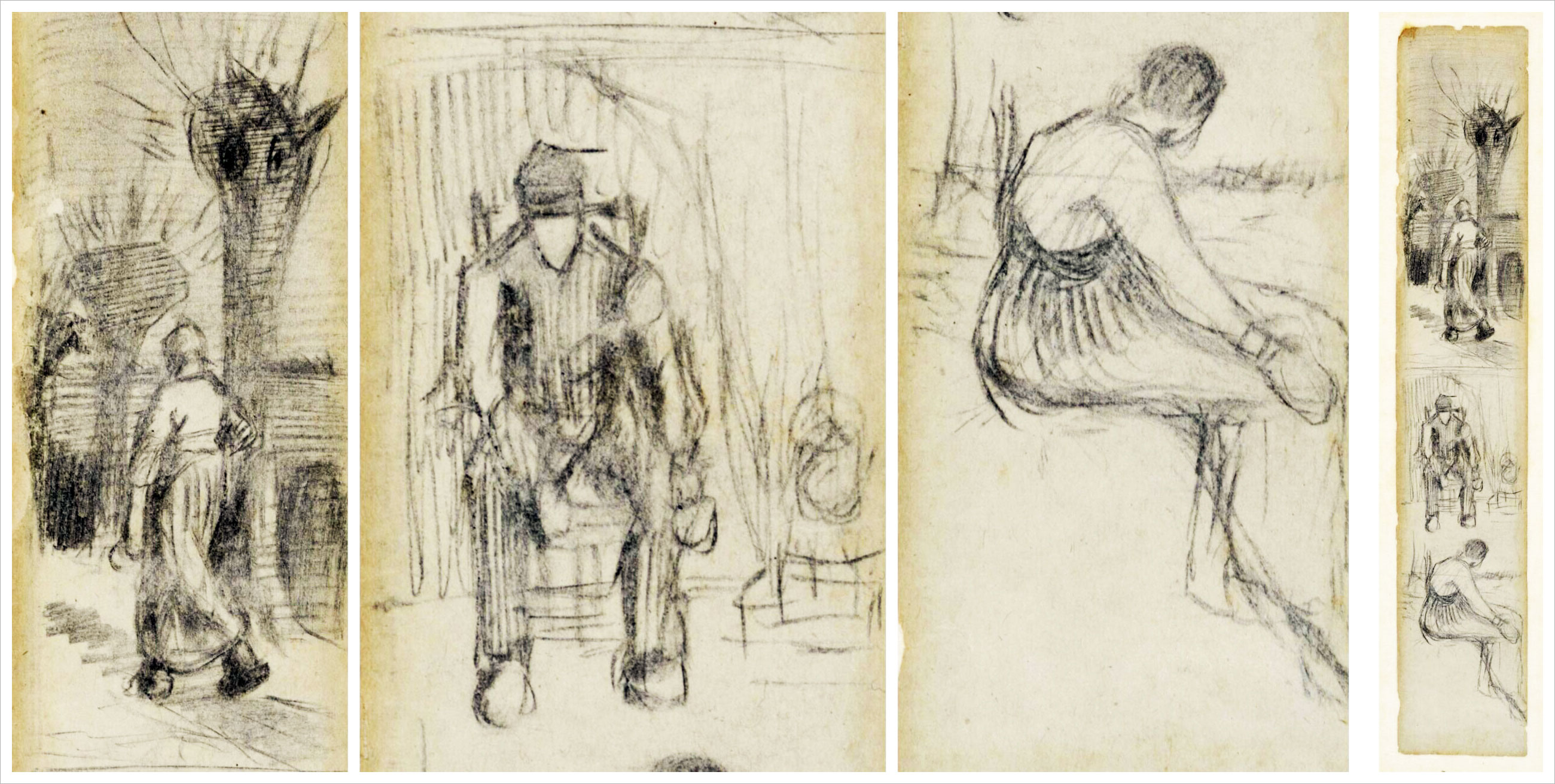 طراحی‌هایی که با مداد بر روی این تکه کاغذ خلق شده‌اند ناشیانه هستند؛ چراکه مدت کمی پس از آنکه «ون‌گوگ» به دنیای هنر قدم گذاشته بود خلق شده‌اند. اما با توجه به اینکه تعداد کمی از طراحی‌های ابتدایی این هنرمند باقی مانده‌، این اثر از اهمیت برخوردار است. ممکن است قدمت این طراحی سه‌گانه در پاییز سال ۱۸۸۱ خلق شده باشد.