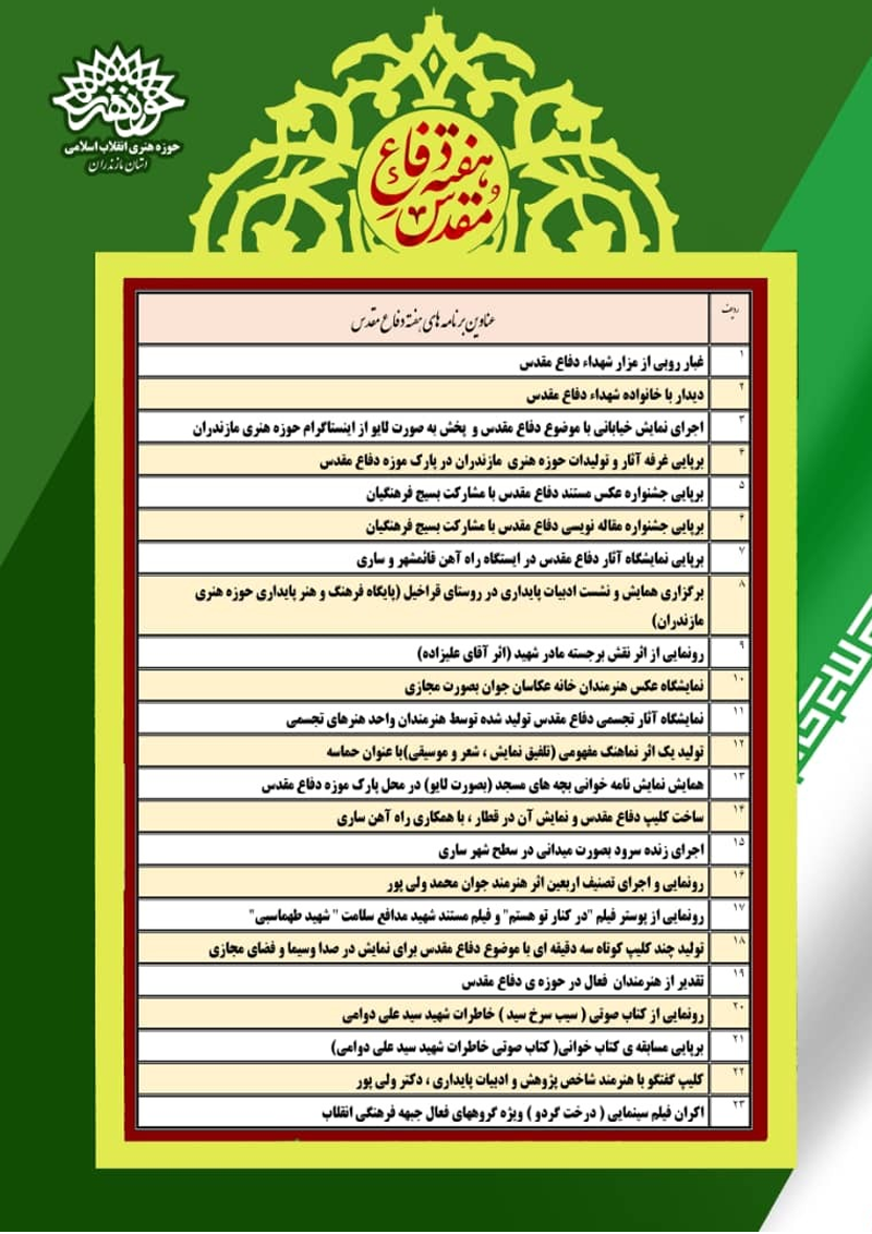 حوزه هنری مازندران با برگزاری بیش از ۲۰ عنوان برنامه به استقبال هفته دفاع مقدس می رود.