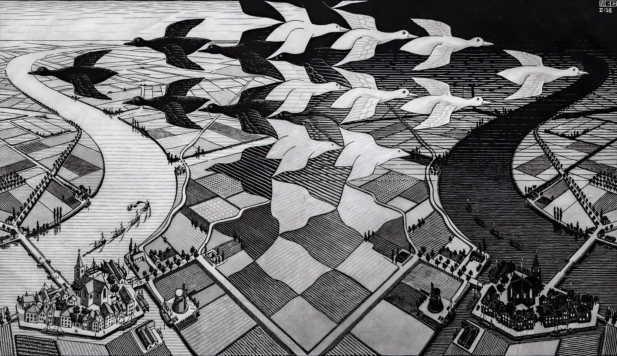 در آثار اشر می توان فهمید که هنرمند برای تلفیق و ترکیب جلوه‌های گوناگون واقعیت، اهمیت ویژه‌ای قائل است. تا قبل از سال ١٩٣٧ تاکید هنرمند بر فضاسازی است و فقط گاه گاهی بر نقش مایه‌هایی برای پوشاندن سراسر سطح اثرش دل می‌بندد اما بعد از آن تاکید بر این نقش مایه‌ها بیشتر می‌شود و به میزان گسترده‌ای به تجربه ایجاد ارتباط توسط فضاهای مختلف دست می یابد. در واقع آنچه در آثار دوران نخستین هنرمند به صورت پنهان وجود داشته در دوره دوم فرصت ابراز و جلوه‌گری پیدا می‌کند و با تسلط تکنیکی روز افزون وی شکوفا می‌شود. اشر به شیوه‌ای مداوم بر اساس یک تم اصیل و بدیع که هسته مرکزی آثار اوست، تنوعات نو و زیبا می‌آفریند.