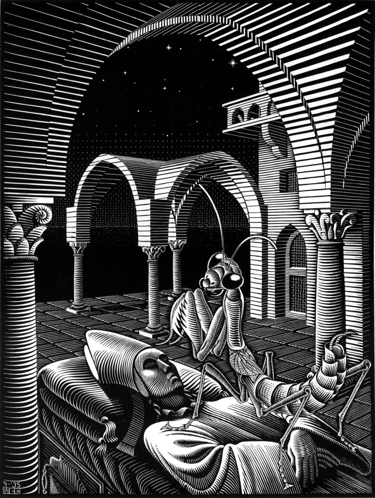 در طول سال‌های قبل از ١٩٣٧، اشر به غیر از ترسیم دنیای پیرامون به ابداعات ذهنی و تخیلات خود نیز اهمیت نشان می‌داد که آثاری را نیز بر همین پایه خلق کرده است. همین طور علاقه وافر او به صنعت گرافیک در کنار اشتغال ذهنی با واقعیات و فانتزی‌های خاص خودش باعث می‌شد تا هنرمند مکررا از تکنیک‌های گرافیک در بیان مقصودش یاری جوید.