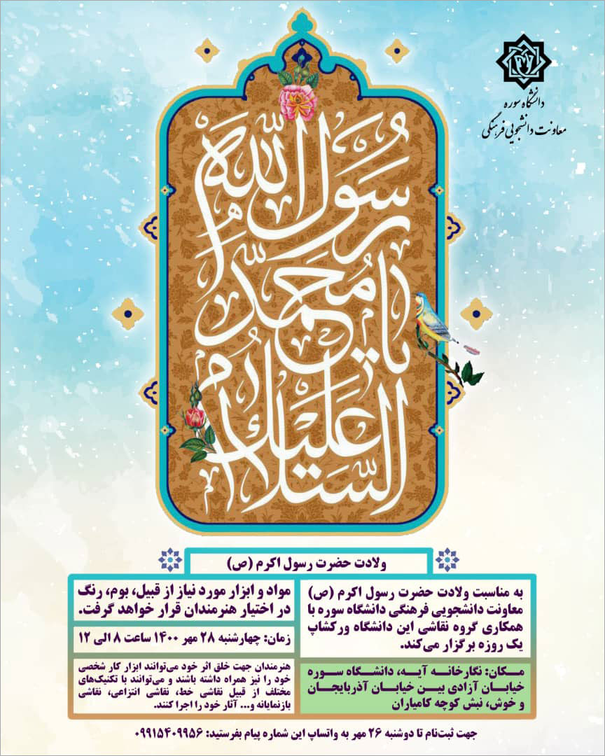 به این منظور، دانشکده هنر دانشگاه سوره، ورکشاپ (کارگاه آموزشی) یک روزه به مناسبت میلاد با سعادت حضرت رسول اکرم (ص)، روز چهارشنبه مورخ ۲۸ مهرماه ساعت ۸ صبح الی ۱۲ ظهر در نگارخانه آیه دانشگاه سوره به آدرس خیابان آزادی، بین خوش و آذربایجان، نبش کوچه کامیاران؛ برگزار میکند.
