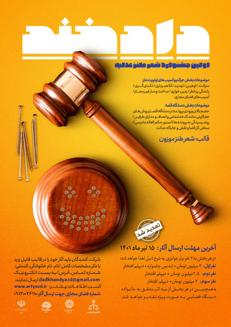 به گزارش روابط عمومی حوزه هنری استان یزد، حجت الاسلام مهدی پرنیان با اشاره به انتشار فراخوان نخستین جشنواره شعر طنز عدلیه «دادخند» در استان یزد گفت: مهلت ارسال آثار به جشنواره که پیش از این پایان خرداد اعلام شده بود تا 15 تیرماه تمدید شد.