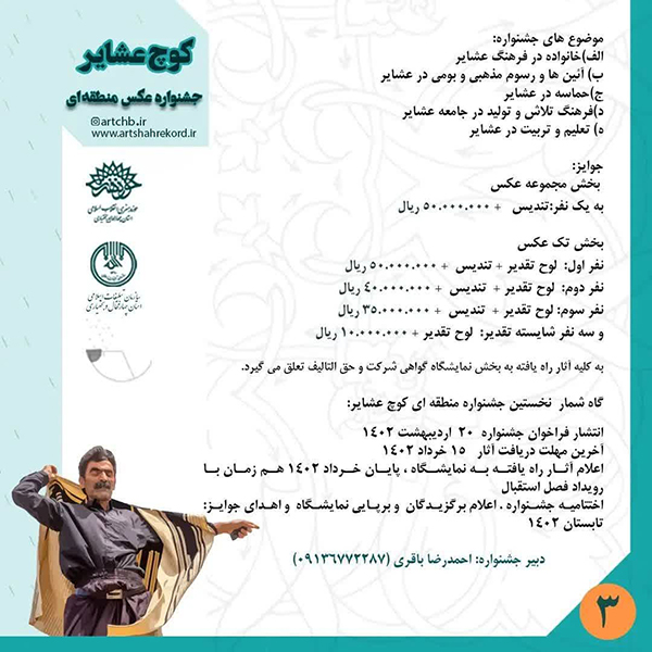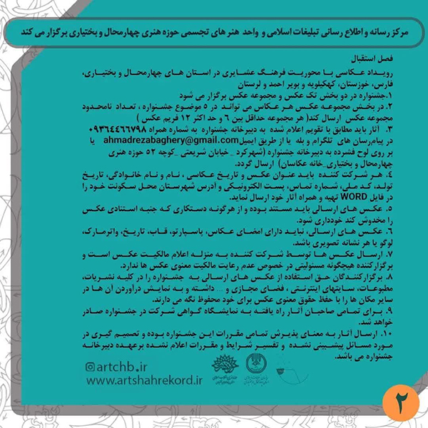 گفتنی است عکاسان شرکت کننده جهت کسب اطلاعات بیشتر میتوانند با شماره تماس 09136772287 تماس حاصل نمایند.