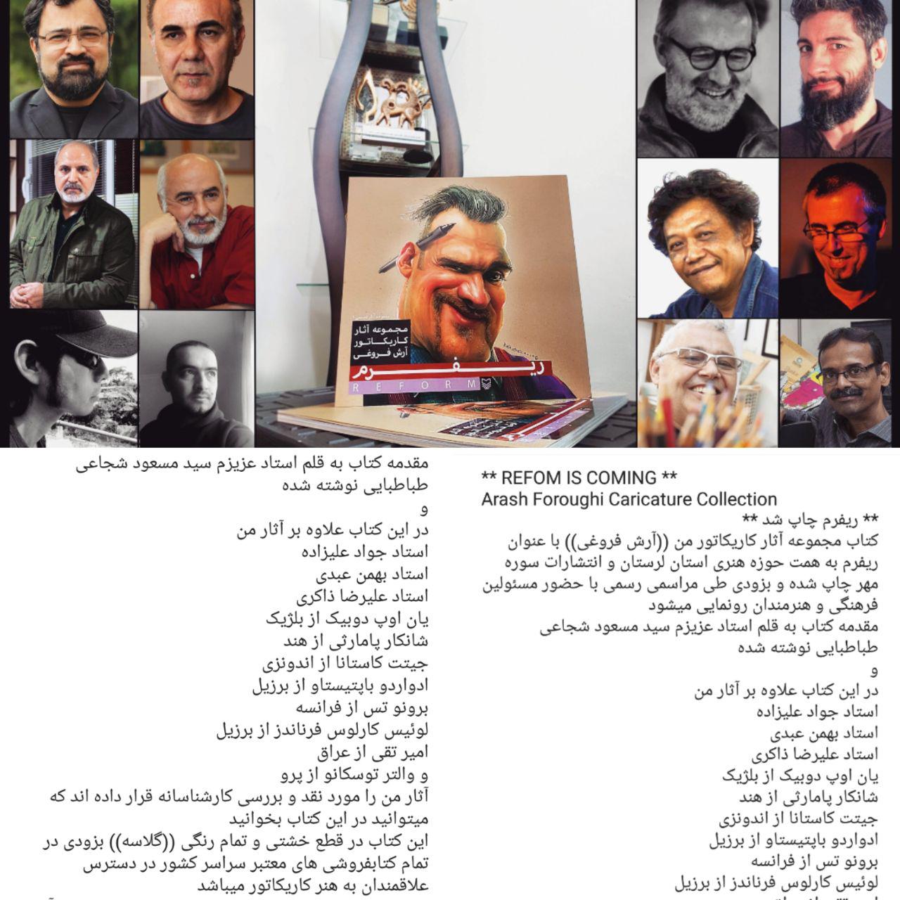 کتاب مجموعه آثار کاریکاتور آرش فروغی با عنوان ریفرم به همت حوزه هنری لرستان و انتشارات سوره مهر چاپ شده و قرار است به زودی طی مراسمی رسمی با حضور مسئولین فرهنگی و هنرمندان رونمایی شود.
