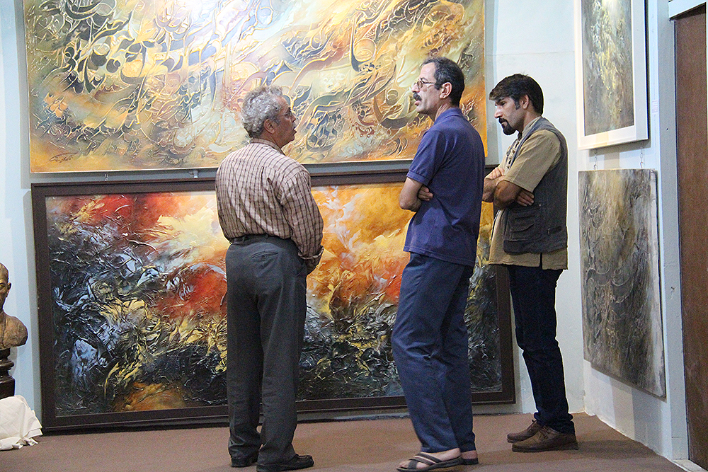 علی محمد شیخی سال‌ها است که در حوزه نقاشی فعال است. اکثر کارهای قبلی او مربوط به ایام جنگ است و بخش مهمی از آن‌ها، شاید اکثریت قریب به اتفاق آن‌ها، با المان‌ها و نقش مایه‌هایی از نمادهای مربوط به عاشورا و یا خطوطی مبین نام ائمه تزیین شده است.
