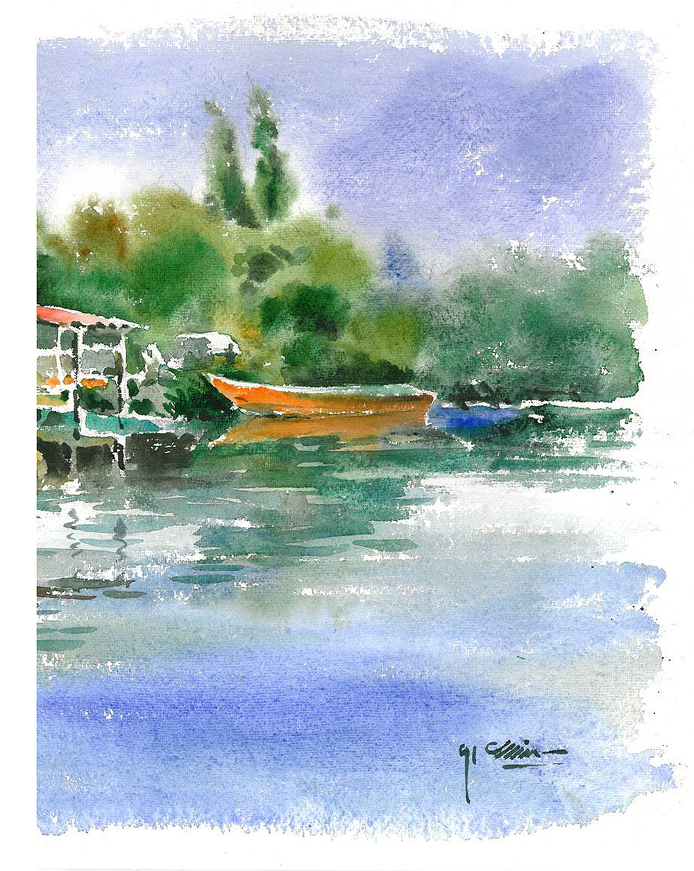 «از دورانی که در هـنرستان اصفهان مشغول به تحصیل هنر بودم به آبرنگ علاقهمند شدم و از همان سالها به آموختن این شیوه از نقاشی پرداختم،دیدن آثار استادانی چون یرواند و سمبات در این راه برایم بسیار سودمند بود.در مورد آبرنگ باید گفت که تکنیک آبرنگ در نقاشی از مشکلترین تـکنیکهاست.در ایـن روش هر قدر تعداد قلم(تاش)روی اثر کمتر باشد،کیفیت آن بهتر خواهد بود.در آبرنگ،نقاش نمیتواند چیزی را در حین نقاشی عوض و یا از بین ببرد، پس یک تصمیم و تفکر اولیه بـاید کـاملا منطقی و حساب شده باشد.البته منظورم از منطقی و حساب شده رد احساس در این شیوه نیست،بلکه تمام این موارد که اصولا فنون کار به شمار میروند در استحالهای از احساس هنرمند شکل میگیرند و سپس روی صفحه نقش میبندند».