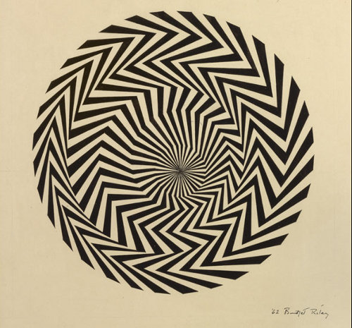 این بانوی هنرمند در سال ۱۹۶۰ اقتباس از نمودارهایی را آغاز کرد که دانشمندان از طریق آنها، فرایندهای ادراکی را مطالعه میکردند، او بعد از تجربههای هرچه ظریفکارانهتری در این حوزه، رفته رفته رنگمایه های خاکستری و سپس سایر رنگها را نیز در کارش وارد کرد. محرکهای دیدمانی، هیچگاه بهتنهایی، هدف او نبودند. رایلی در آثارش، عناصری را برمینگرد که بهعنوان بخشی از طبیعت به کار میگیرد، مانند عناصر تشکیل دهندهٔ یک منظره: درختها، ابرها، تپهها و رودخانهها و با درهم رفتن آنها، چنان پدیدارهای سحرانگیزی میآفریند که بسیار بیش از سر جمع ِعناصر فُرمی و رنگی یک مجموعهاند، این تصاویر، بیش از تأثیرگذاری علمی، دارای تأثیر برانگیزی غنایی و شاعرانه اند.