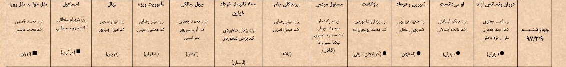 نمایش «نهال» امیر رجب پور ساعت 19:30 دقیقه در خانه هنرمندان، «اسماعیل» شهرام سلطانی ساعت 18:30 در سالن ماه و «مثل خواب، مثل رویا» ساعت 19:30 دقیقه در سالن مهر و «700 ثانیه» پژمان شاهوری ساعت 22:30 دقیقه در پارک آب و آتش برگزار می شود.