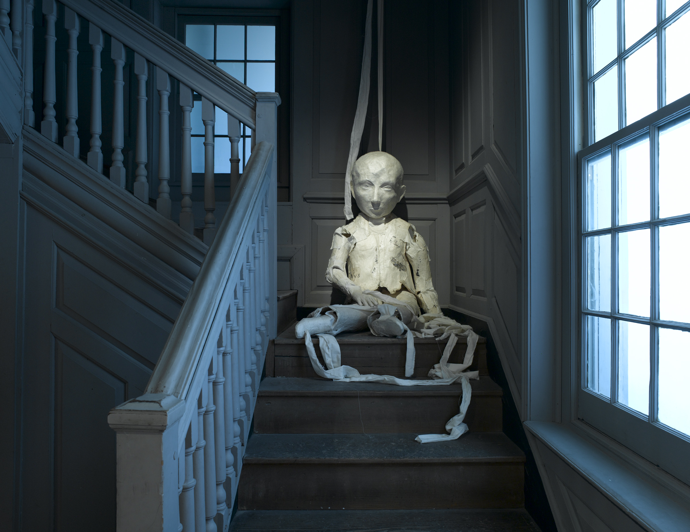 اینستالیشن "Wonder" در پیش زمینه، "Hoarfrost with Rabbit"، فولاد ضد زنگ، 2014، در گالری Pace