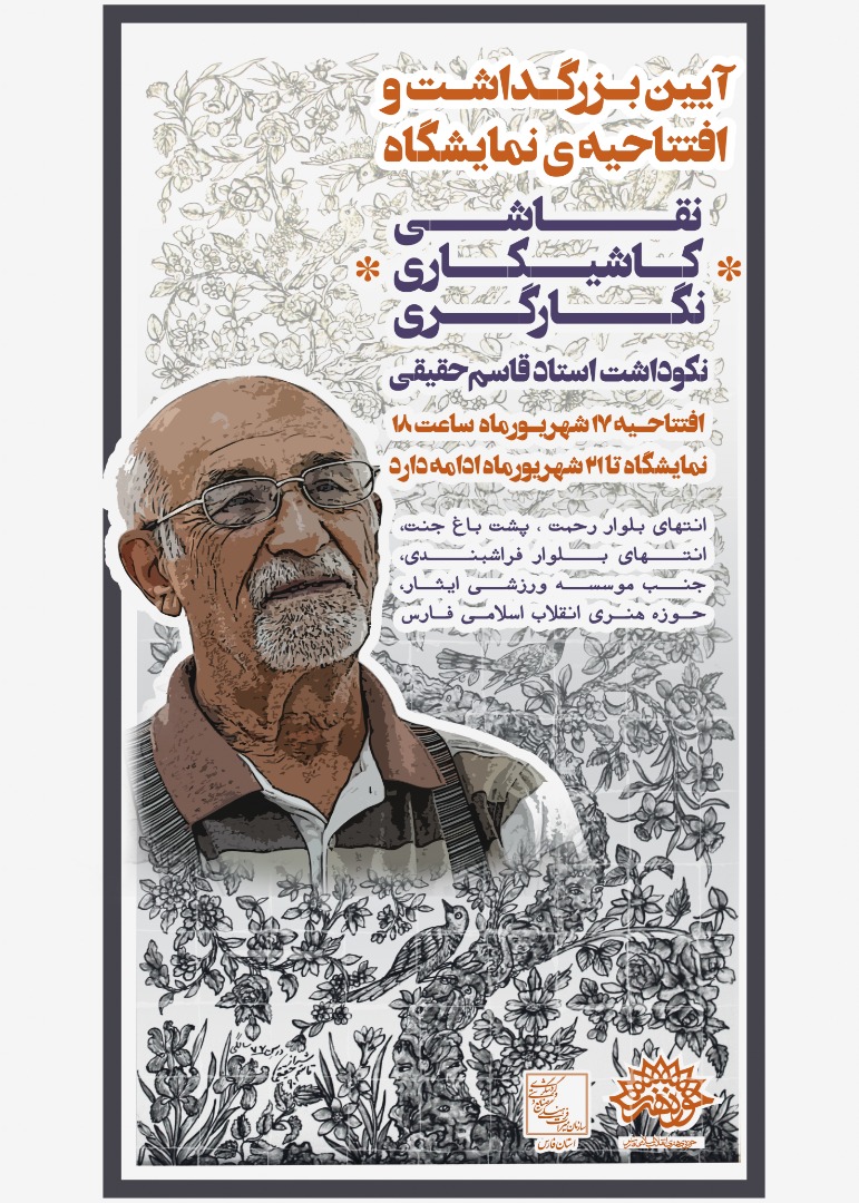 آیین افتتاح نمایشگاه و نکوداشت قاسم حقیقی هنرمند پیشکسوت نقاشی نگارگری و کاشیکاری در حوزه هنری انقلاب اسلامی استان فارس برگزار خواهد شد.