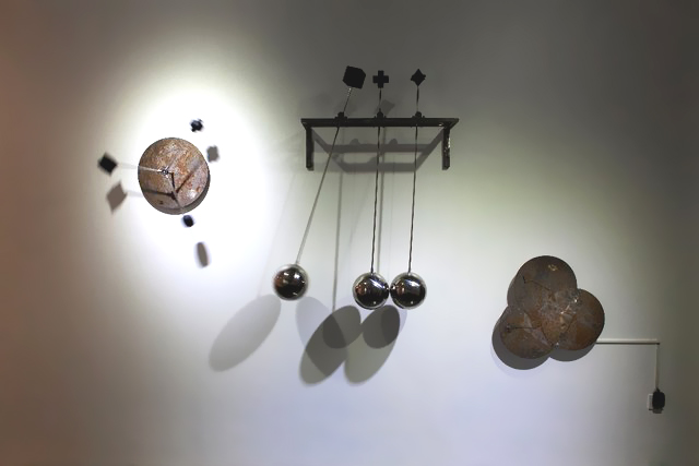 این هنرمند افزود: همانگونه که در چیدمان مشاهده می‌کنید سه‌ آونگ کروی در حال جنبش و برخورد به یکدیگر هستند. در این مدل که بر پایه الگوی علمی «گهواره نیوتون» است، سه آونگ کروی را به جنبش درآورده‌ام، شکلی تهی از لبه‌ها و گوشه‌های تیز نمادهای یاد شده. در تفسیر خود از این مدل علمی تاب خوردن بی پایان آونگ‌ها نشان می‌دهد چگونه نیروی جنبشی هر یک از این نظام‌های اعتقادی با دیگران در ستیز است.