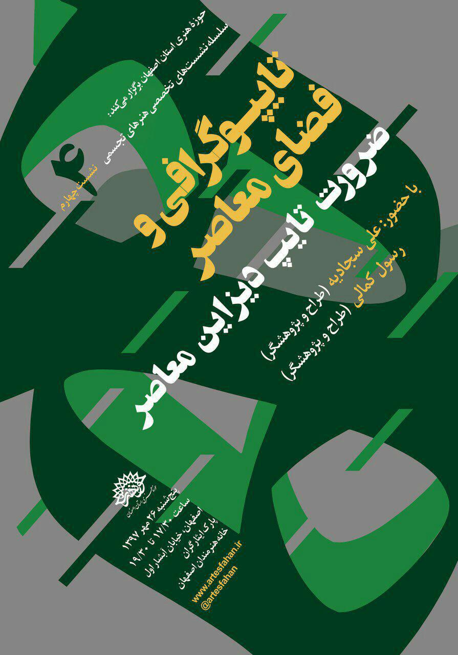 به گزارش روابط عمومی حوزه هنری استان اصفهان، به نقل از استاد محسن سلیمانی مدیر تجسمی حوزه هنری استان اصفهان این نشست تخصصی یکی از جلسات سلسله نشست های هنرهای تجسمی است که این بار با موضوع «تایپوگرافی و فضای معاصر» در خانه هنرمندان اصفهان برگزار می شود.