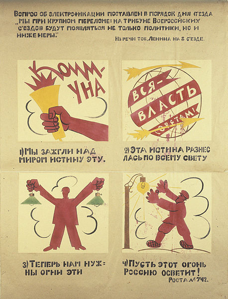 رابرت هیوز، در کتاب سال 1980 خود، درباره تاریخچه هنر مدرن، به نام «شوک بدعت»، خاطرنشان میکند که بین سالهای 1917 تا 1923، بیش از سه هزار پوستر چاپ شد تا ایدئولوژی سیاسی و اجتماعی جدید را به دورترین نقاط اتحاد جماهیر ببرد و این در کشوری که پیش از آن برقراری ارتباط ناشناخته بود، شاهکاری حیرت انگیز به شمار میآمد. همین استفاده دراماتیک از پوسترها در چین و بسیاری از کشورهای جهان سوم، امروز نیز دیده میشود.