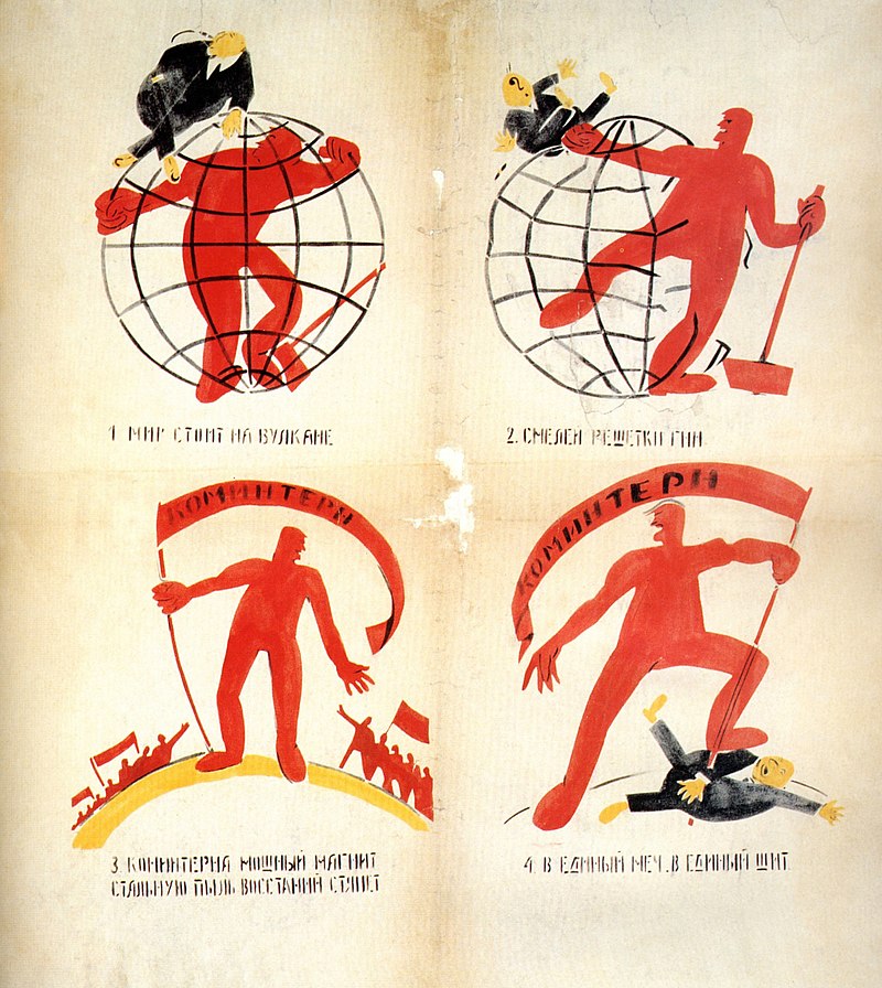 طرحهای گرافیکی، در سالهای پس از انقلاب 1917، روسیه، در این کشور در کنار «فیلم»، به عنوان رسانهای تودهای رشد و توسعه یافته و مبدل به زبانی جدید برای صدور انقلاب شد. این طرحها، تأثیر مهمی بر هنرمندان آلمان و هلند، در سالهای واپسین جنگ جهانی اول داشت. کشور روسیه، تصویرسازی سنتی پرقدرتی داشت. این تصویرسازی «لوبک» خوانده میشد. لوبکها، شمایلکشی داستانهای مقدسین بود که به صورت کندهکاری روی صفحات چوب، ساخته میشد. از سوی دیگر مجلاّت مصوّر سیاسی آن سالهای روسیه تحتتأثیر جنبش روشنفکرانه «نوتوریستی» بودند. در چنین فضای متلاطم و پربیم و امیدی که از محرومیتهای مادی ناشی شده بود، در خلال جنگ داخلی و نیز تنشهای سیاسی در چنین جامعه کمسواد، تصاویر و واژهها دستخوش انقلاب شدند. تا قبل از استفاده وسیع از رادیو، بر اثر برقکشی سرتاسری، برای اینکه مردم روسیه را با پیشرفتهای سیاسی و گزارشهای مربوط به جبهههای جنگ داخلی سالهای 1918 تا 1921، باخبر سازند، تنها طریقه، سخنرانی بود.
