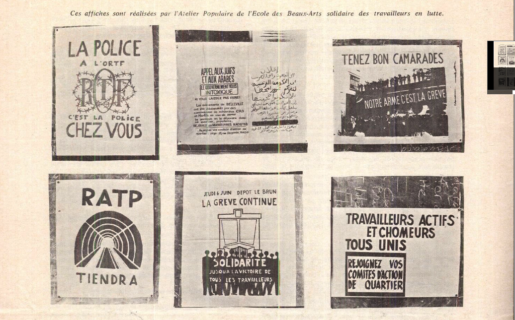 در جریان انقلاب ماه مه 1968 فرانسه‌، پوسترهایی‌ توسط‌ دانشجویان «مدرسه هنرهای‌ زیبا»، پاریس، در کارگاهی‌ به‌ نام‌ «آتلیه‌ خلق»، ساخته می‌شد که به روش سیلک اسکرین تهیه‌ می‌شدند و از این‌رو خرج زیادی نداشتند و از لحاظ جنبه‌های گرافیکی، موجز بودند. نوشته‌ها، گاه همان‌ شعارهای جسورانه نبردهای خیابانی‌ با پلیس بود. آنها، همان شیوه خط سفید گچ بر روی زمینه سیاه‌  تخته کلاس را تعالی داده و به میان خیابانها کشیدند. این دانشجویان، سیصد‌ عدد‌ یا بیشتر، پوستر طراحی کرده و در پایتخت، توزیع نمودند. پیام آنها کاملا روشن بود و سریعا به چاپ می‌رسید. پوسترها، تک‌رنگ، و به طور کلی، سیاه و سفید بودند و از طریق سیلک‌ اسکرین‌ یا استنسیل و تصویر منفی، ساخته می‌شدند. دانشجویان معترض، با این‌ تصاویر ساده گرافیکی و جملاتی دستنویس، آنهم‌ به صورت سیاه در زمینه سفید، علیه‌ جامعه‌ مصرف زده، موضع اعتراضی گرفتند‌. در‌ واقع، هیچ‌ رسانه و هیچ پیامی به اندازه این پوسترها، گویا نبودند.