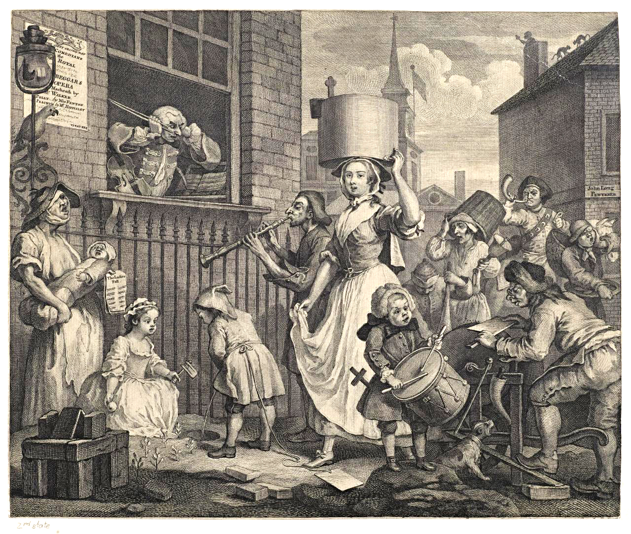 در این تابلو یک زن شیرفروش را می‌بینیم که به‌طور مستقیم به ما نگاه می‌کند و دامنش را برای جلوگیری از برخورد با کثیفی‌ها روی زمین کمی بالا برده است. چهره این زن به وضوح با افراد دیگر در تابلو که چهره‌هایشان به‌ دلیل نوشیدن مشروب، عصبانیت و یا حماقت، از شکل افتاده، متفاوت است. با این حال در میان هیاهو و جنجال نوازندگان خیابانی، ترانه این زن به‌ گوش نوازنده حرفه‌ای ویولون که گوش خود را گرفته است، نمی‌رسد.