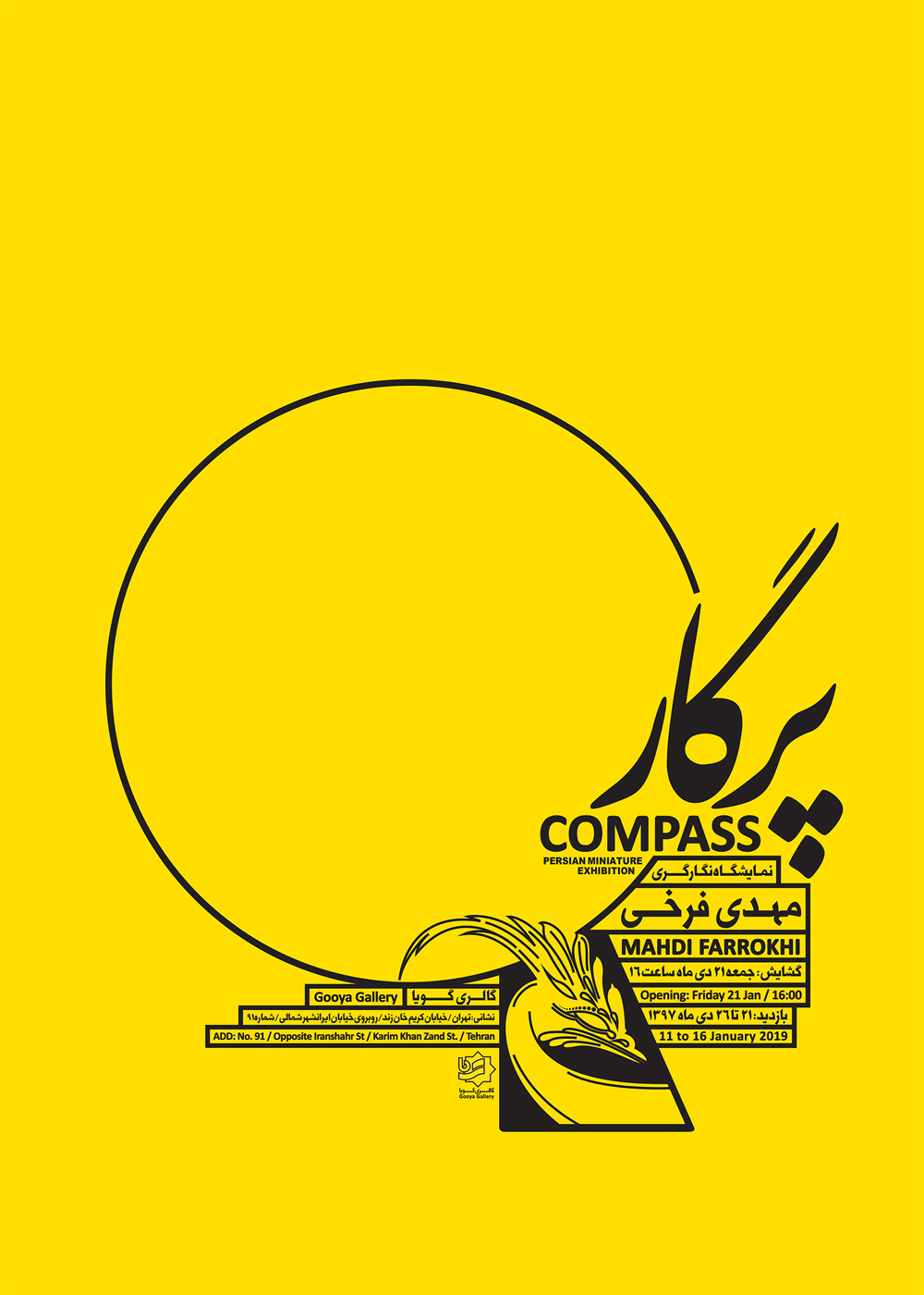 آیین گشایش نمایشگاه "پرگار" عصر جمعه، 21 دی ماه 1397، ساعت 16 در گالری گویا انجام می شود. علاقمندان می توانند از 21 تا 26 دی ماه از ساعت 9 الی 21 به گالری گویا به آدرس: تهران، خیابان کریمخان زند، روبروی خیابان ایرانشهر، پلاک 89 مراجعه نمایند.