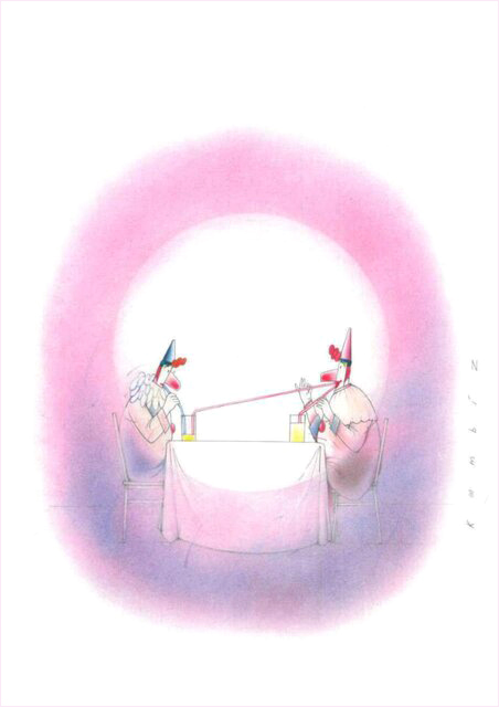 در یکی از آثار نمایشگاه «طراحی‌های عمو کامبیز» طرحی دیده می‌شود که دو دلقک برروی یک میز در حال خوردن یک نوشیدنی هستند. یکی از این دو نفر نی بلندی را در نوشیدنی دلقک دیگر قرار داده و هم‌زمان در حال خوردن از دو لیوان است. در حالی که نوشیدنی فرد دیگر به سرعت در حال اتمام است و گویی از این موضوع نیز ناراحت است ولی با این حال هنوز متوجه اصل داستان نشده و تمام حواسش بر روی لیوان نوشیدنی خود است. فرد دیگر هم با لبخندی موزیانه در حال تمام کردن سهم دلقک دیگر است.