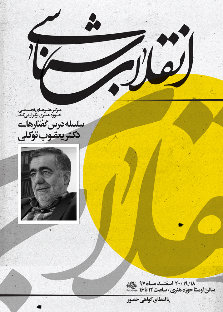 به گزارش روابط عمومی مرکز تجسمی حوزه هنری، به همت مرکز هنرهای تجسمی حوزه هنری، سلسله درس‌گفتارهای دکتر یعقوب توکلی با موضوع «انقلاب شناسی» در سالن اوستای حوزه هنری برگزار می‌شود.