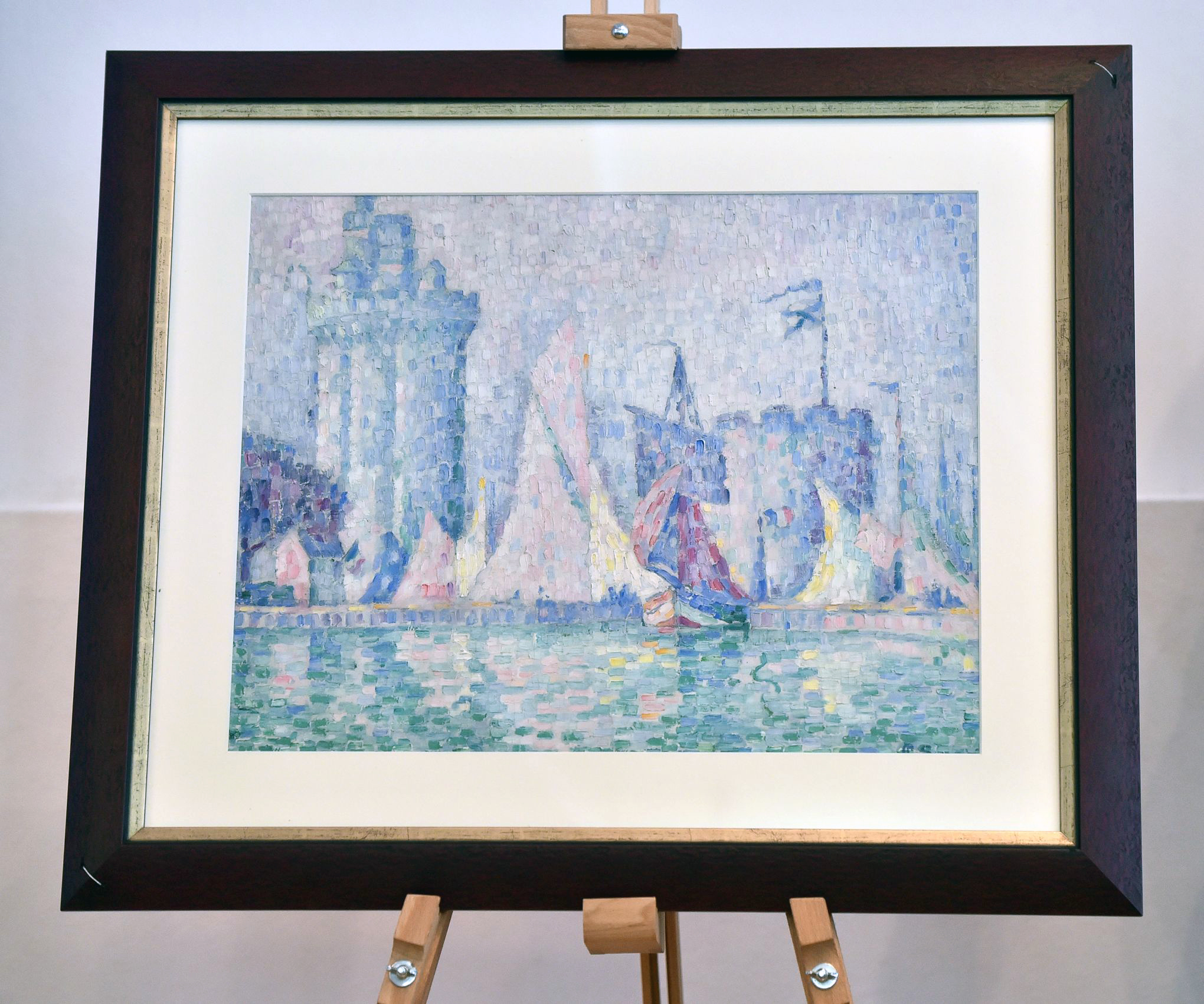 تصویر نقاشی (Port de la Rochelle» (۱۹۱۵» متعلق به هنرمند فرانسوی (Paul Signac (۱۸۶۳-۱۹۳۵ در وزارت امور داخلی اوکراین در کیف در تاریخ ۲۳ آوریل ۲۰۱۹ نشان داده شدهاست.