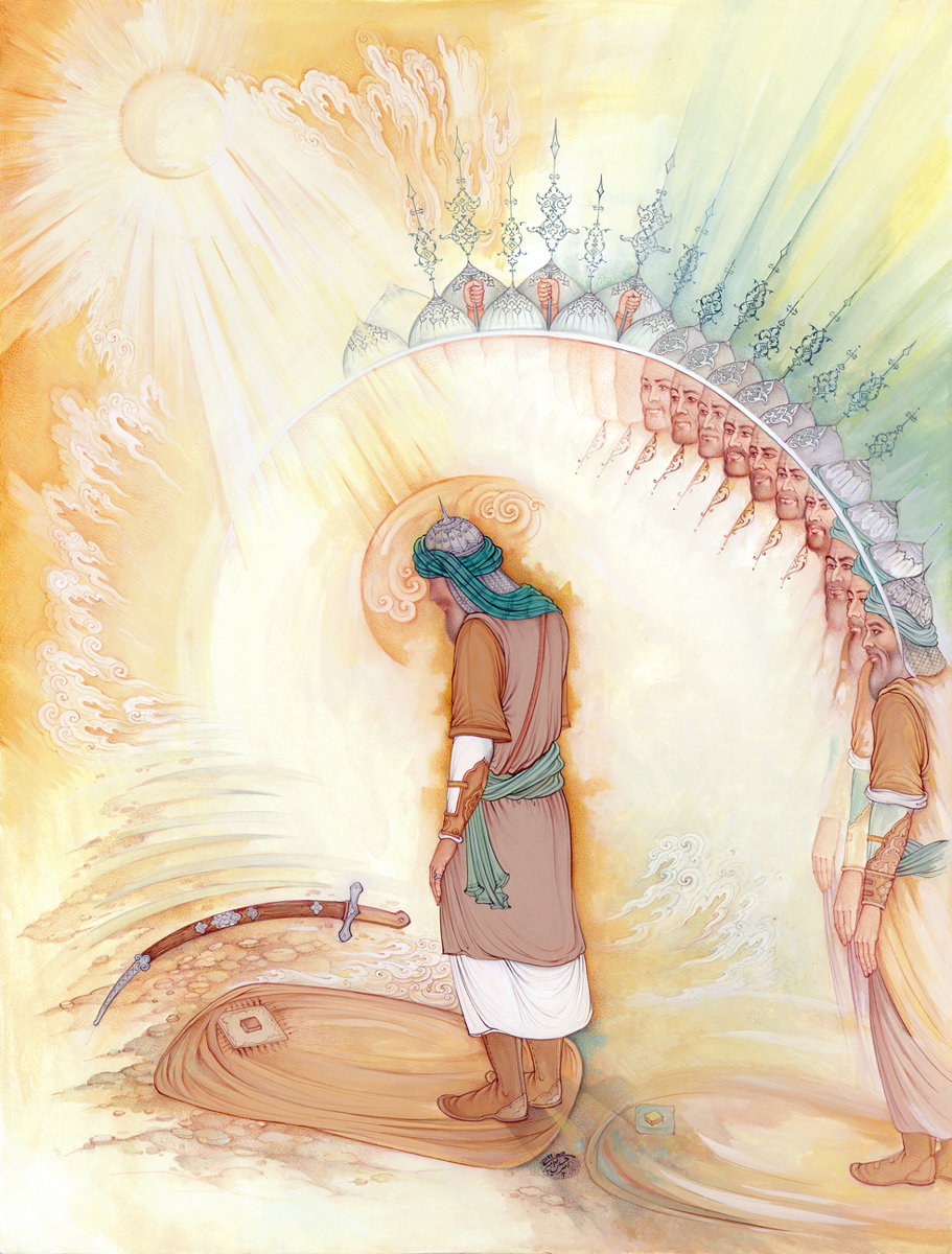 بعضی چیزها را باید با تشبیه نشان بدهیم. مثلا در تابلوی نماز با استفاده از تذهیب که درش تکرار و وحدت وجود دارد سرهای یاران امام حسین(ع) و شمشیر و کلاه خودهایی را نشان داده‌ام که در حال محافظت از نماز هستند و در عین حال یک حالت تزئینی بوجود آمده است و در حالت ایستادن امام حسین (ع) افتادگی و خلوص را به تصویر کشیده‌ام.