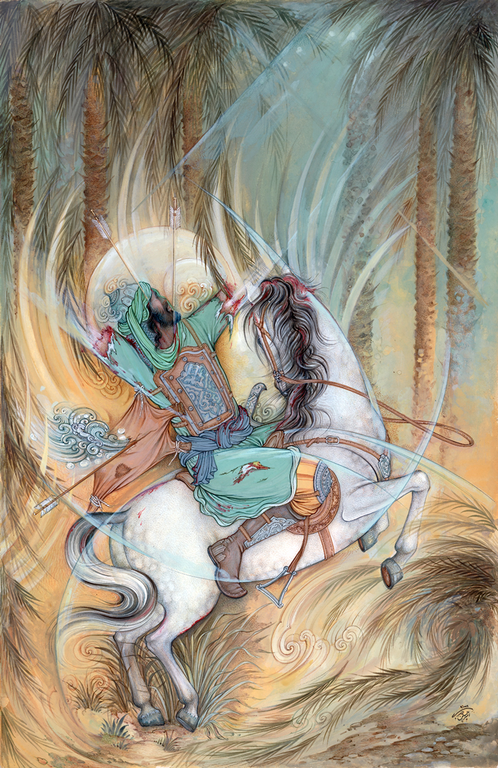 یا در تابلوی دیگری که دست‌های قطع شده حضرت ابوالفضل(ع) را در نخلستان به نمایش گذاشته‌ام با اینکه دست‌های حضرت را قطع شده کشیده‌ام ولی اقتدار حضرت را در اثر تصویر کرده‌ام و دست‌ها را رو به بالا و آسمان کشیده‌ام و نورهای آسمان را با نور جای خالی دست‌ها یکی کرده‌ام و حرکت شمشیرهایی که مخفیانه در نخلستان بر حضرت وارد می‌آمده است را نشان داده‌ام.