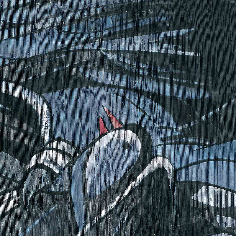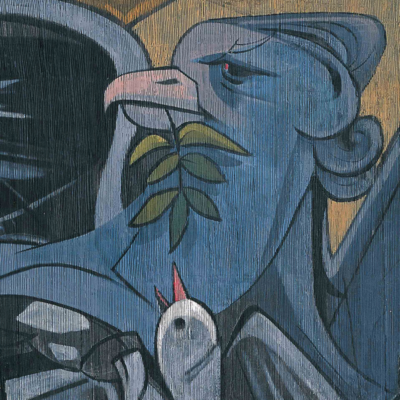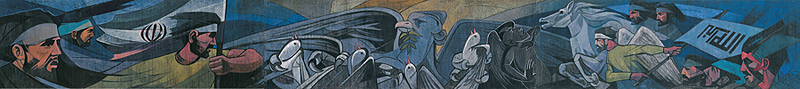 قابی بسیار کشیده که باید حتما برای دیدنش سرتان را بچرخانید. فیگوری با دست بسیار قوی پرچم یک انقلاب را در دست دارد و در سوی دیگر تابلو، فرشته ای با ظاهری انقلابی، دارد با بالهایی بزرگ پرچمی الهی را با خود حمل می کند. در مرکز تابلو پرنده ای که همان نماد استکبار است، به پرندگان منادی صلح حمله کرده است و نماد صلحی (شاخه زیتون) که از زمان حضرت نوح حامل آن است را بر دهان دارد، گویی اکنون زمان انقلاب است. نقاشی هنریست که همواره از گونه های خود تاثیر می پذیرد و نقاشی ایران در سالهای انقلاب اسلامی نیز از قاعده مستثنا نیست.