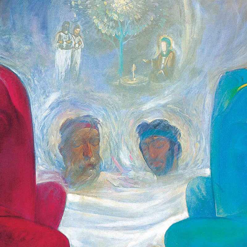 نکته جالب درباره این نقاشی را باید در بخش بالای نقاشی جستجو کرد که بهشت را به تصویر کشیده است و از سنت نقاشی ایرانی بهره گرفته است . عناصردرهم آمیخته شده و در این بخشی که ماهیتی آسمانی دارد فضای نقاشی تخت تر و آری از حجم پردازیست، که همین اشاره بر غیر مادی بودن جهان آسمانی دارد.